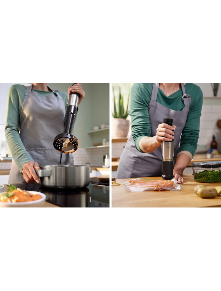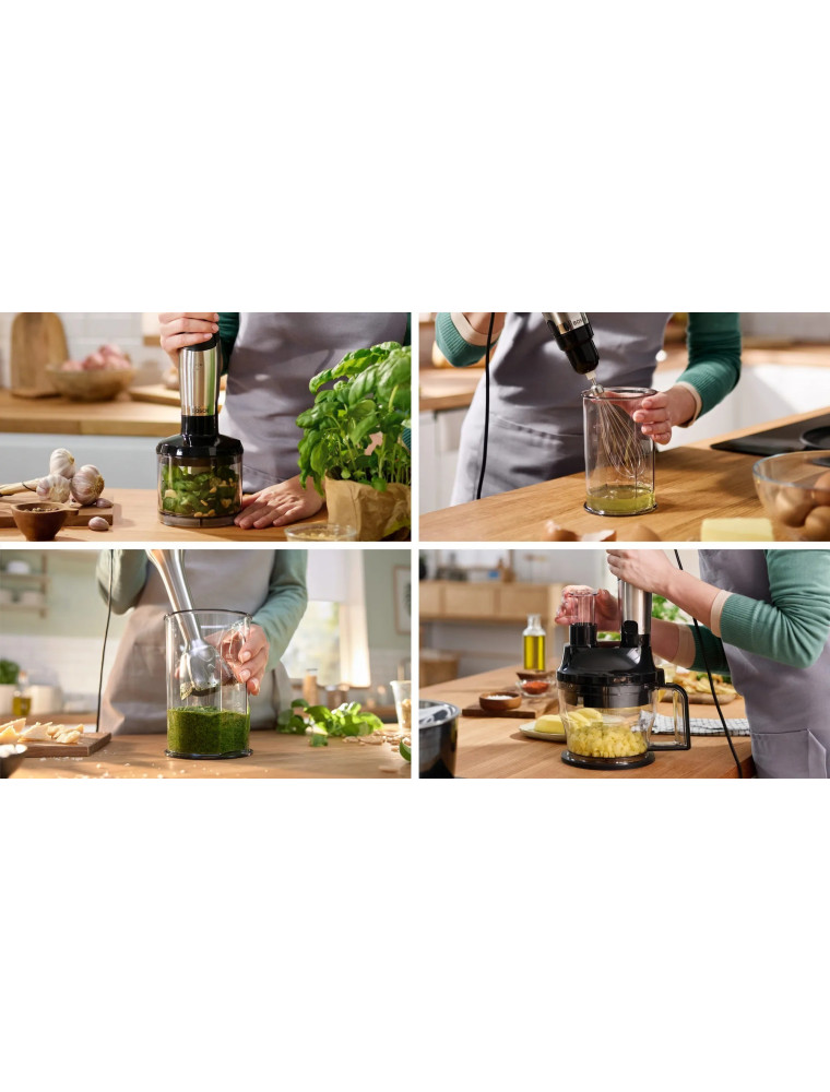Все насадки легко отсоединяются одним нажатием кнопки и пригодны для мытья в посудомоечной машине. Мощности в 1200 Вт достаточно для выполнения задач разной сложности: измельчения мяса в фарш, нарезки твердых овощей и фруктов, взбивания яичных белков, замешивания густого теста и т. п. А для управления используется всего одна кнопка: чем сильнее вы на нее давите — тем выше становится скорость. Это значительно облегчает использование блендера одной рукой.