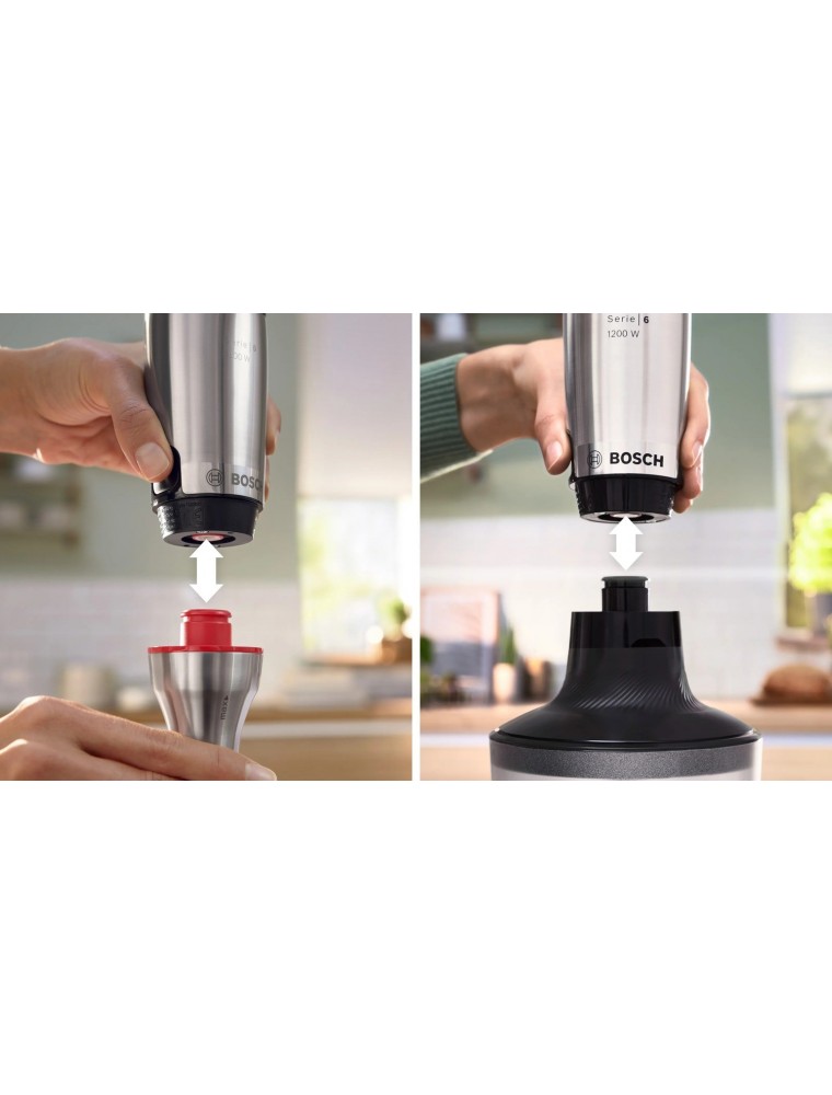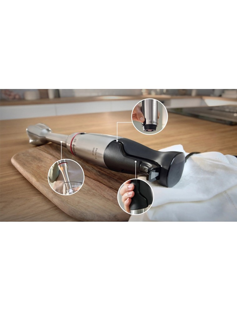 Погружной блендер из серии Bosch ErgoMaster относится к среднему ценовому сегменту и сочетает в себе качественные материалы, высокую производительность и расширенные возможности благодаря нескольким дополнительным насадкам в комплекте. Обладая мощностью в 1200 Вт, он способен работать практически с любыми продуктами, в том числе сырыми овощами, мясом, орехами и другими твердыми ингредиентами.