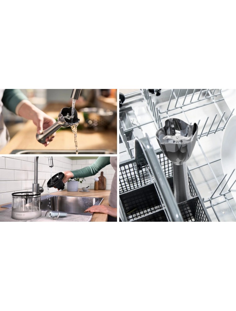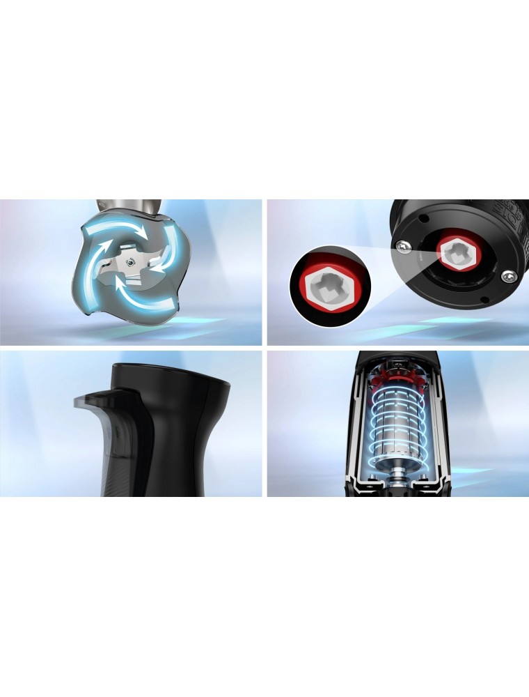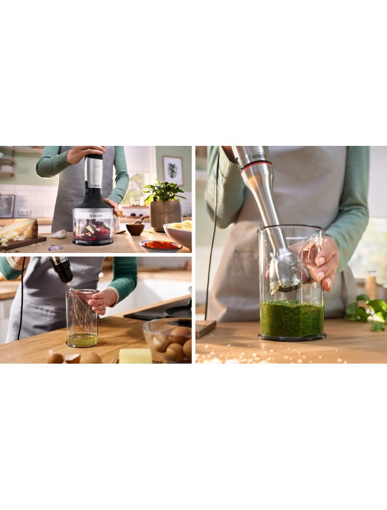 Измельчитель включает в себя небольшую пластиковую чашу и стандартный нож с двумя S-образными лезвиями. Он предназначен для измельчения мяса, овощей, зелени, сыра и т. д. Насадка-венчик выступает неким аналогом миксера и подходит для взбивания легких масс вроде крема, меренги из яичных белков и жидкого теста. Помимо этого, в набор включен мерный стакан, в котором можно отмерять необходимое количество ингредиентов и там же смешивать их. Также для удобства использования предусмотрены эргономичная ручка с покрытием Soft Touch и максимально простое управление всего одной кнопкой. Она регулирует скорость в зависимости от силы нажатия, позволяя точно контролировать и подбирать оптимальные настройки в зависимости от типа продуктов, рецептуры и желаемого результата.