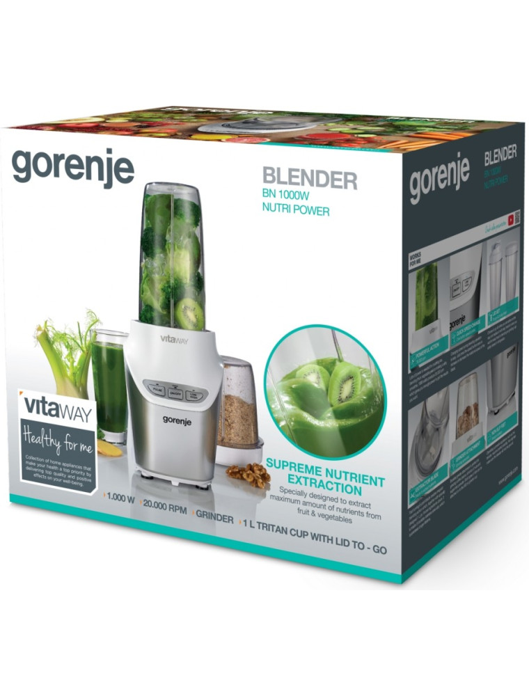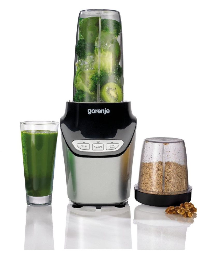 Блендер Gorenje BN1000 представляет собой удобный и сравнительно компактный настольный аппарат с устойчивыми резиновыми ножками и долговечным шестилопастным ножевым блоком, изготовленным из нержавеющей стали. Фирменные лезвия отлично сохраняют заточку и остаются безупречно острыми при работе в агрессивно-кислых средах, которые образуются при измельчении лимонов, яблок, апельсинов, слив, алычи, ананасов, томаты и др. Приличная мощность (1000 Вт) и высокий крутящий момент электродвигателя позволяет раскручивать ножи до скорости в 20000 об/мин, что в свою очередь ускоряет смешивание любых ингредиентов. Оборудован простой и интуитивно понятной трехкнопочной панелью управления с LED-индикацией, поддерживает две фиксированных скорости и импульсный режим.