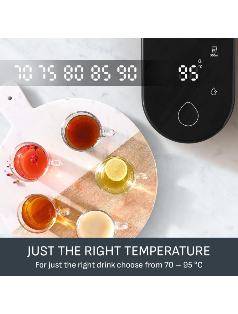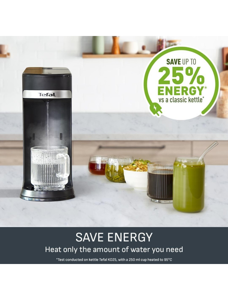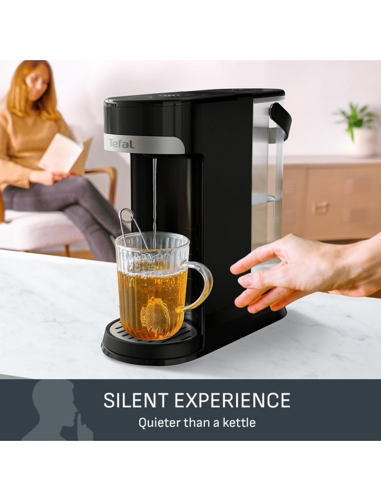 Для правильного заваривания требовательных сортов чая или кофе диспенсер горячей воды Tefal Instant Hot Water BR3508 получил встроенный терморегулятор с шестью фиксированными температурными режимами в диапазоне от 70 до 95 °C. За непрерывный мониторинг фактических градусов отвечает встроенный термометр, а все рабочие параметры выводятся на дисплей с собственной подсветкой и сенсорной панелью управления. Поскольку нагретая вода подается непосредственно в посуду пользователя, в основании конструкции предусмотрен практичный каплесборник для защиты поверхностей от случайных брызг. При общих габаритах 12.8х32х30.5 см пластиковый корпус аппарата отличается крайне малой шириной, что дает возможность эргономично разместить его даже на плотно заставленной кухонной столешнице.
