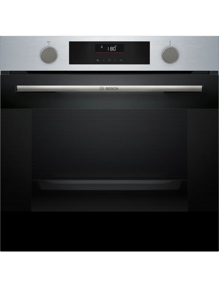 Электрический духовой шкаф бренда Bosch — это представитель линейки стандарт-класса Serie 4 и среднебюджетный прибор с большой рабочей камерой на 76 литров. Модель выполнена в привычном дизайне (фронт с серебристыми и черными вставками) и получила лаконичные органы управления — пару поворотных переключателей и сенсорную панель с небольшим инфо-дисплеем. Духовой шкаф Bosch HUA 736ER0 обзавелся телескопическими направляющими на одном уровне, а также поддерживает две сервисные функции ухода — паровую и каталитическую очистку (специальное покрытие EcoClean, которое расщепляет жир, и загрязнения находится на задней стенке рабочей камеры).