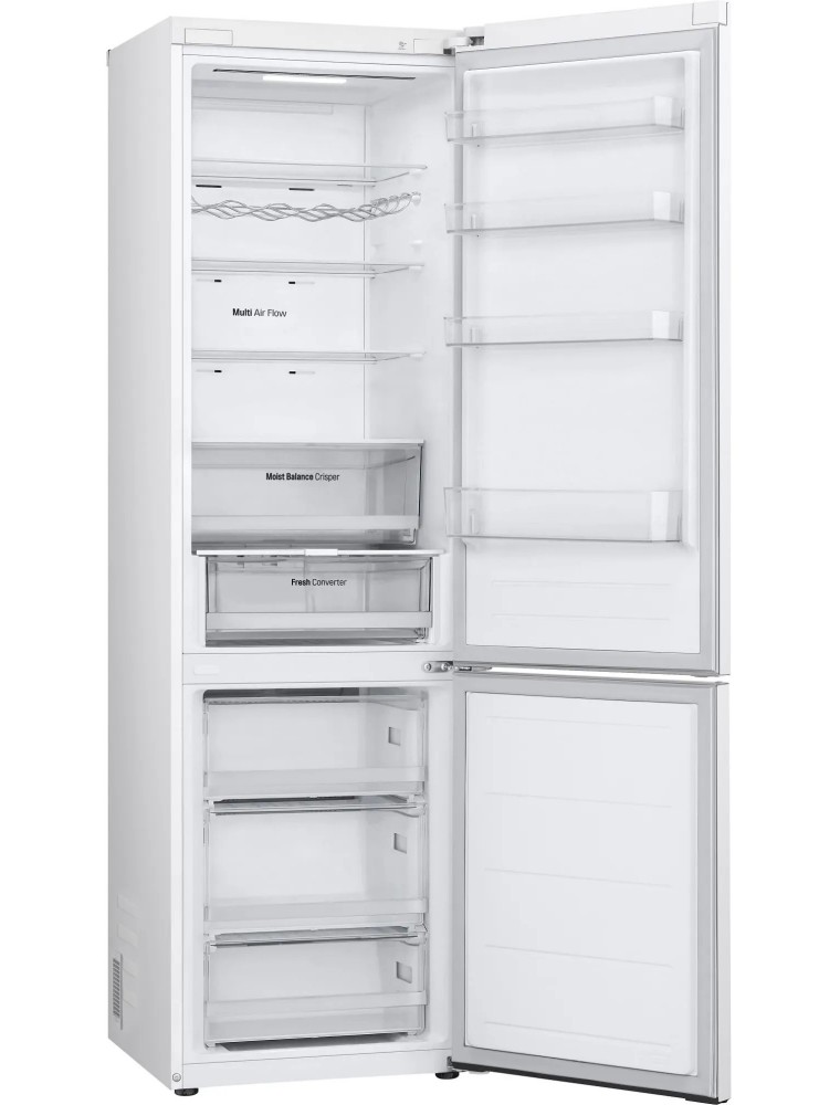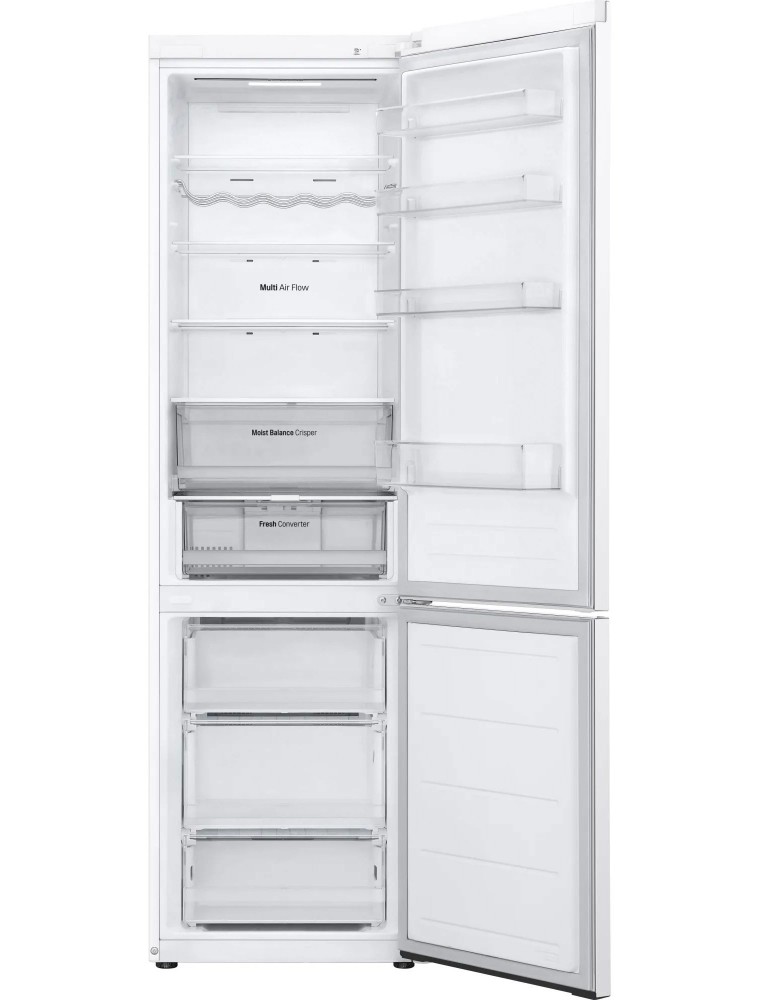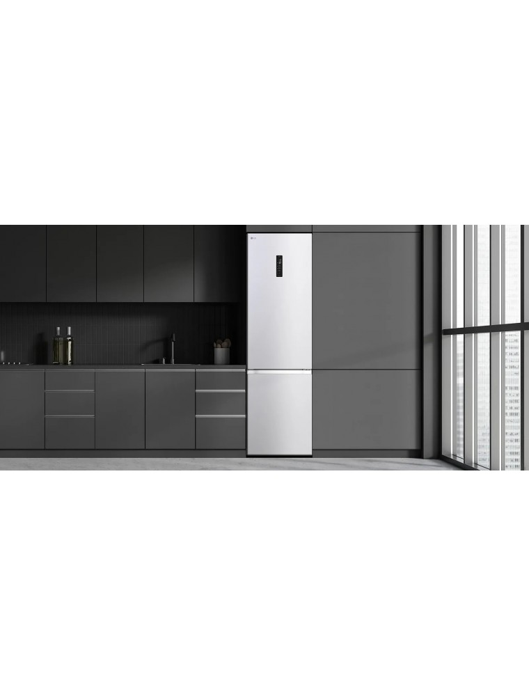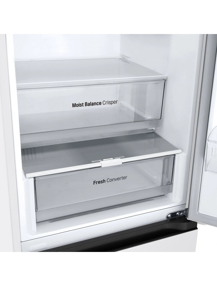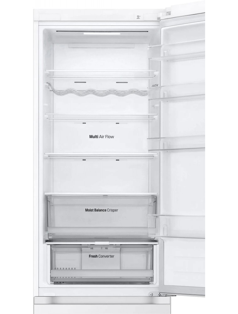 Дебютант 2025 года от бренда LG — это белый 2-камерный холодильник, который можно отнести к агрегатам средней ценовой категории. Среди основных фишек прибора выделяется система Total No Frost, благодаря которой от пользователей не требуется ручная разморозка, а также удобное управление. Во-первых, модель предусматривает внешнее сенсорное управление с дисплеем и функцией индикации открытой двери.