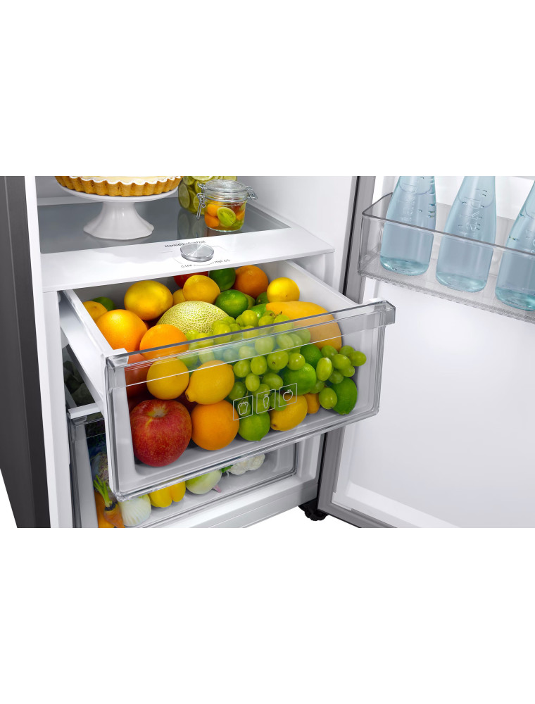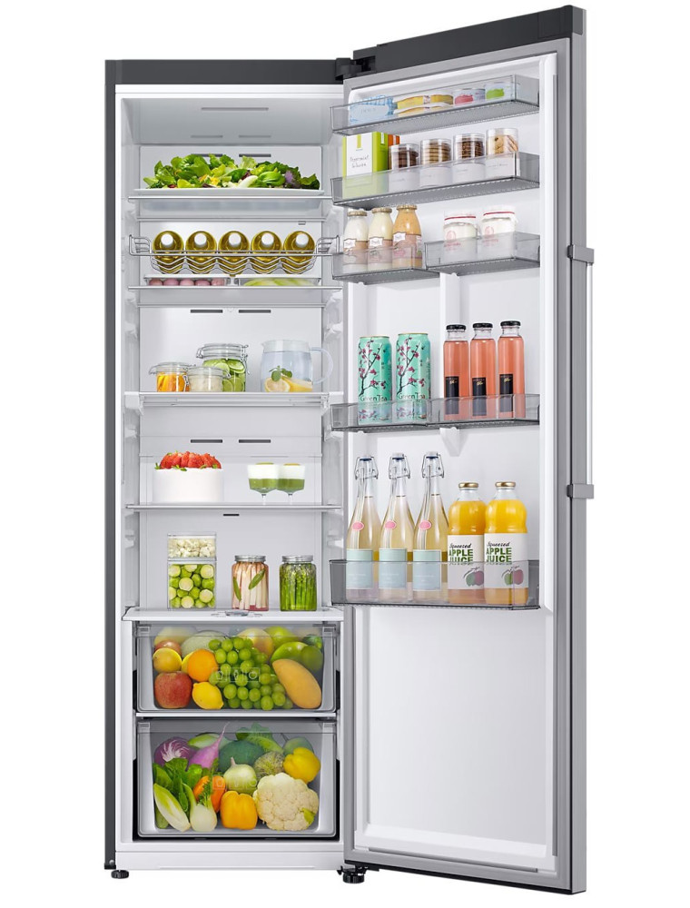 Однокамерный холодильник бренда Samsung — это агрегат в расцветке под нержавейку, который можно отнести к решениям на стыке среднего и продвинутого класса. Модель позиционируется в качестве прибора Twin, то есть способна создать тандем Side-by-side с аналогичным по дизайну и габаритам (высота 186 см) морозильным шкафом. Плюс ее можно рекомендовать тем, кто уже имеет другую отдельностоящую морозилку или вовсе не замораживает продукты.