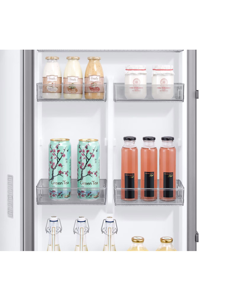 Холодильник Samsung RR39C7BJ5S9 поддерживает два варианта управления: традиционный — с помощью внешней сенсорной панели с дисплеем, и через интернет — имеется модуль Wi-Fi и нужно установить на смартфон фирменное приложение SmartThings. Рабочая камера характеризуется большой вместительностью — 387 литров. Для организации хранения предлагаются 5 открытых полок, включая одну складную, которая высвобождает больше пространства по высоте под габаритные продукты или посуду, а также подвесной держатель на 5 бутылок.