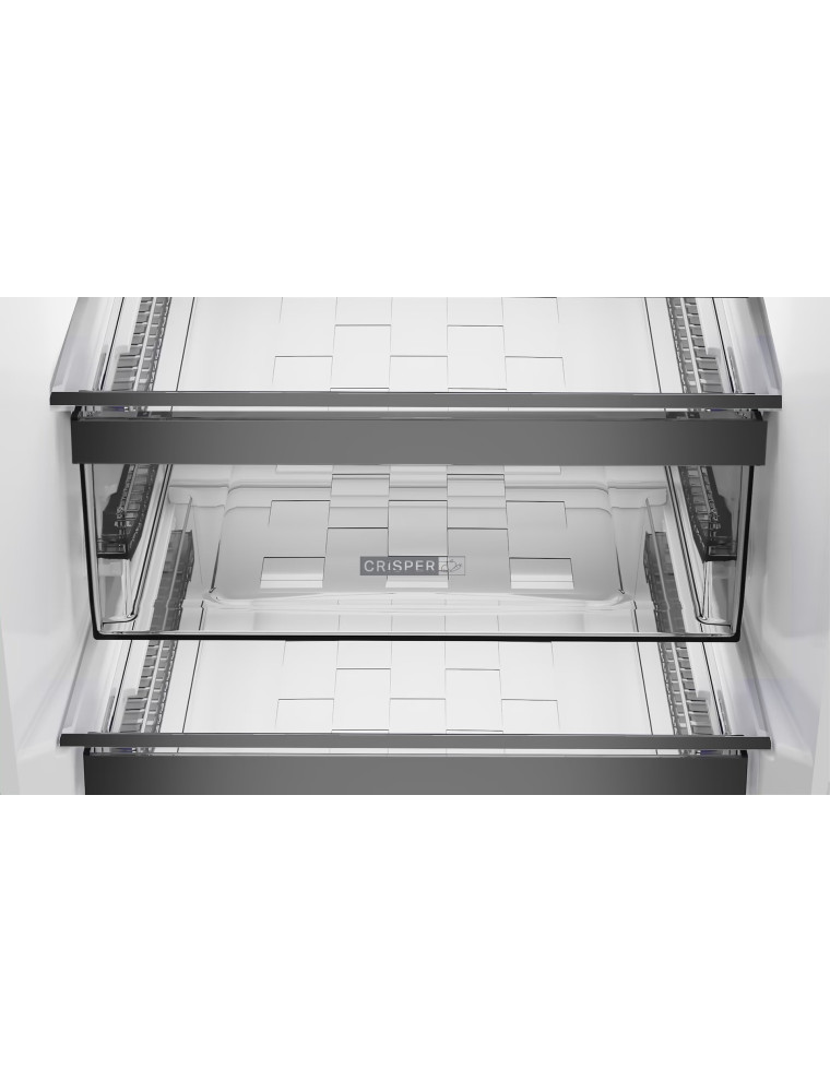 Благодаря последней холодильник Whirlpool WHK 26402 XP4U не нуждается в ручном размораживании. При высоте 203.5 см полезный объем прибора достигает 355 литров, что можно считать хорошим вариантом для больших семей. В верхней части корпуса находится 249-литровое холодильное отделение с четверкой открытых полок, двумя выдвижными ящиками и 4 широкими дверными корзинами. Ниже располагается морозильная камера на 106 литров. Она предусматривает 3 бокса, готова заморозить максимум 6 кг продуктов в сутки, а при отключении электричества должна держать холод до 11 часов. Из других особенностей модели стоит выделить индикацию закрытия дверцы, наличие режима отпуска, а также невысокий уровень шума в работе (до 35 дБ), энергопотребление класса A++ с показателем в 260 кВт*ч за год.