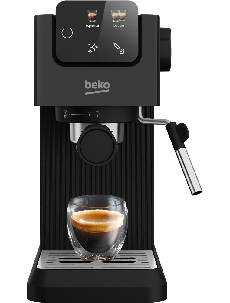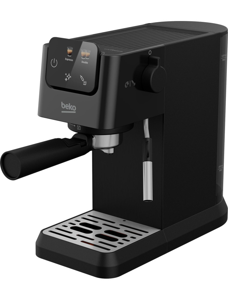 Черная рожковая эспрессо-кофеварка торговой марки Beko — это среднебюджетное решение в относительно компактном корпусе (ширина 14.5 см) с удобными органами управлениями. Для взаимодействия с моделью предложена стильная сенсорная панель, которая среди прочего позволяет выбрать программу — приготовление обычного или двойного эспрессо, а также запустить цикл самоочистки или приготовление пара для взбивания молока.