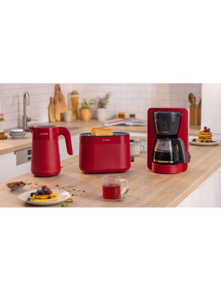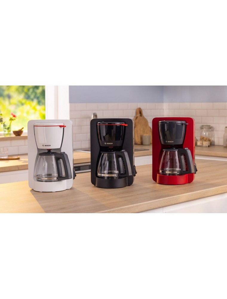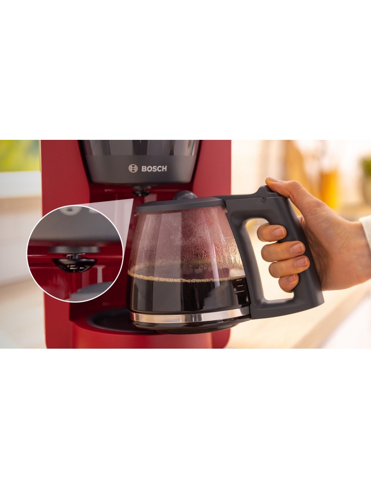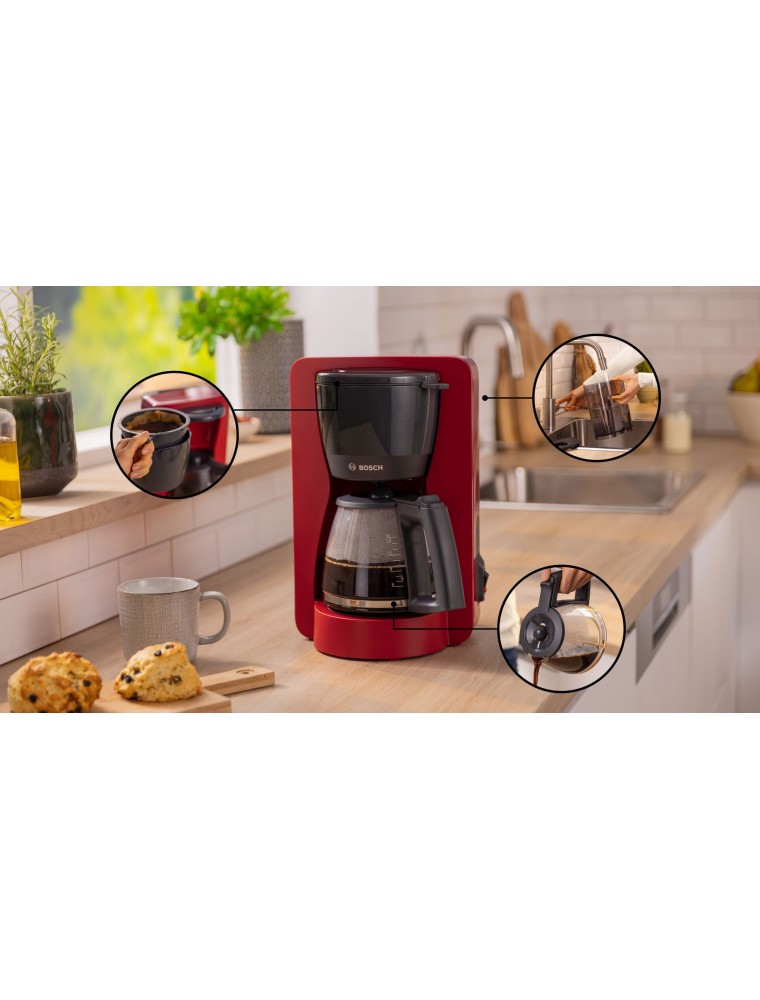 Красная капельная кофеварка производства Bosch — это прибор средней ценовой категории для ценителей фильтр-кофе. Модель выполнена из пластика, для которого заявлена безопасность по отношению к пищевым продуктам, а также отсутствие потенциально вредных компонентов, таких как BPA. Для подачи готового бодрящего напитка предложен стеклянный графин, вмещающий до 10 порций кофе. Кофеварка Bosch MyMoment TKA 2M114 предусматривает эргономичную конструкцию с поворотным держателем фильтра, противокапельной системой и съемным прозрачным резервуаром для воды емкостью 1.4 литра.
