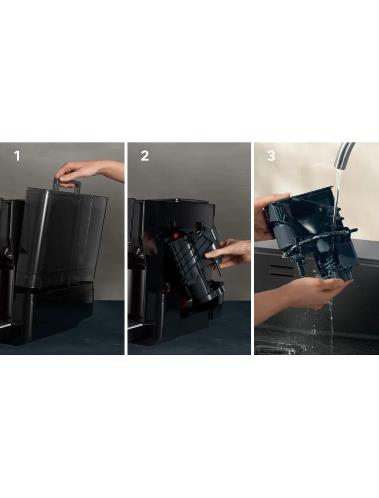 Аппаратная начинка прибора включает качественную керамическую кофемолку ceramDrive с 6 регулировками степени помола, съемный заварочный узел, помпу на 19 бар, 1500-ваттный нагреватель и практичный автоматический капучинатор. Так, молочная система предусматривает отводную трубку, совместимую с различными емкостями (от стакана до тетрапака), позволяет настраивать плотность пенки, а также дополнена паровой самоочисткой autoMilk Clean. Стоит учитывать, не самые маленькие габариты прибора (31x38x47 см), но при этом здесь имеется большой 2.4-литровый резервуар для воды и вместительный бункер на 320 грамм зерен.