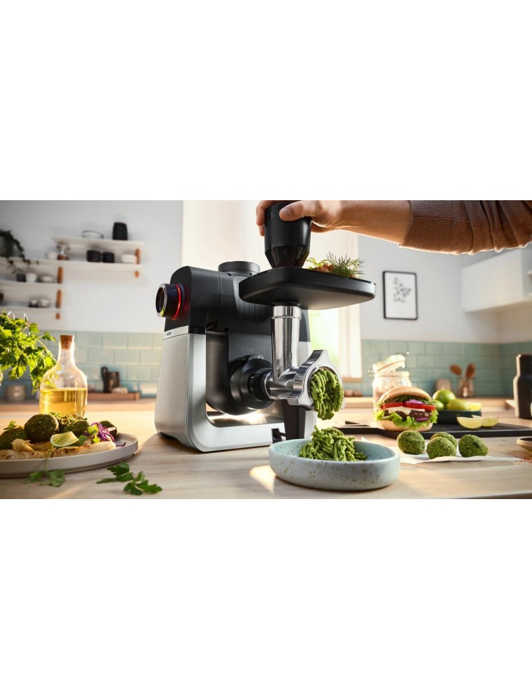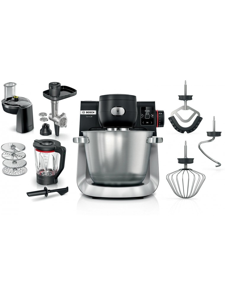 Насадка-блендер, которая крепится к верхнему приводу Bosch MUM S6ZS34, позволяет смешивать горячие супы-пюре и холодные коктейли со льдом в большой чаше из термостойкого стекла. Насадка-мясорубка поставляется с двумя дисками для крупного и мелкого помола и предназначена для приготовления фарша и паштетов. Помимо этого, в комплектацию кухонного комбайна входит сквозной фуд-процессор с четырьмя насадками.