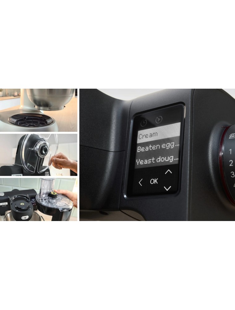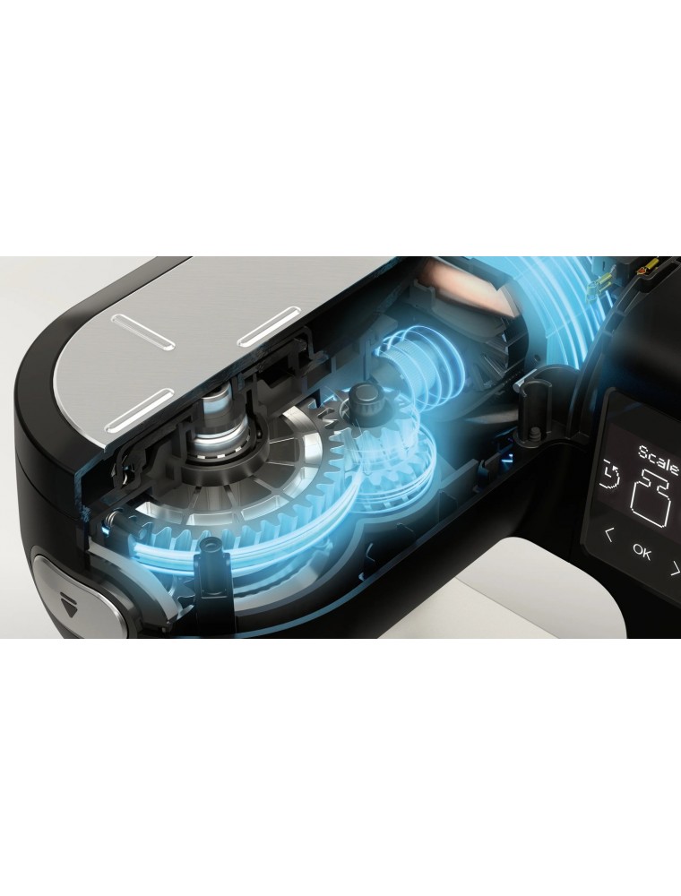 д.). Также к преимуществам модели относятся крупный сенсорный дисплей для управления, таймер, засекающий время до окончания цикла, отсек для хранения шнура и встроенные весы с точностью до 1 грамма. Взвешивать ингредиенты можно прямо в чаше миксера или на верхней панели корпуса. В то же время дисплей отображает вес, выбранные настройки и отсчитывает время до завершения процесса.