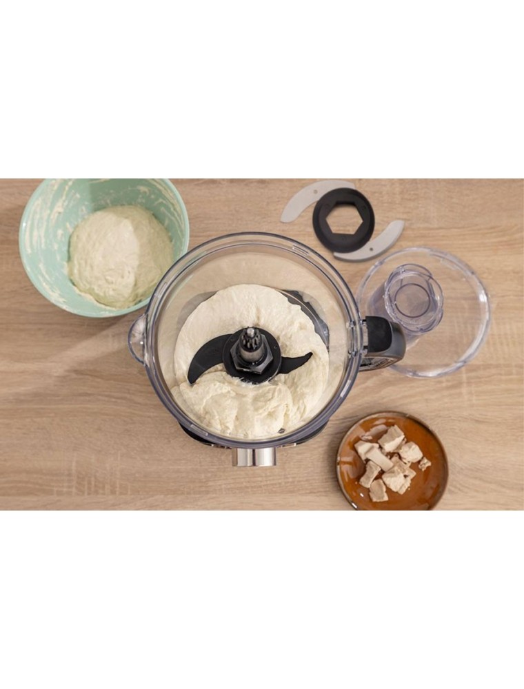 В данном случае представляет собой зауженную книзу чашу, на дне которой расположен лопастной нож. Такое приспособление подходит как для смешивания жидкостей в однородную массу (например, для приготовления коктейлей или жидкого теста), так и для измельчения некоторых твердых продуктов (например, фруктов и овощей) в однородное пюре. Блендер обычно устанавливается вместо основной чаши, однако есть устройства, позволяющие использовать две чаши одновременно.