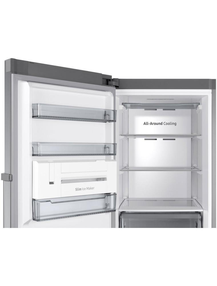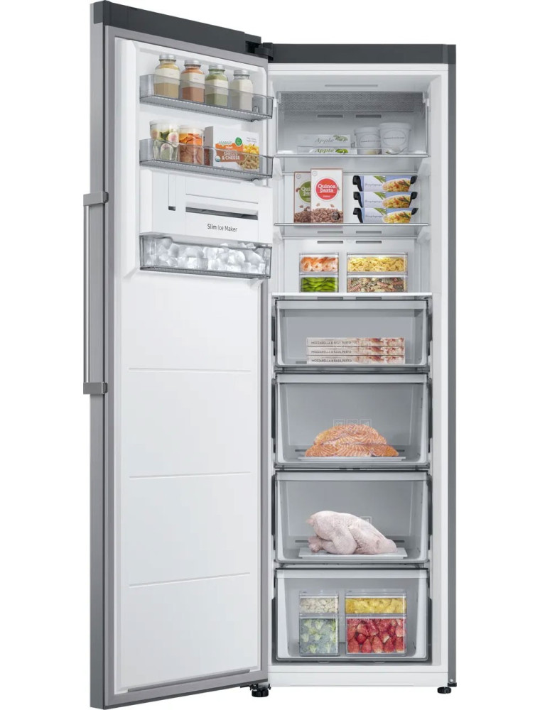 Дебютант 2025 года в линейке бренда Samsung — это серебристый (расцветка под нержавейку) морозильный шкаф продвинутого класса. Модель при высоте корпуса 186 см имеет полезный объем в 323 литра, что способно заинтересовать большие семьи и всех тех, кто делает серьезные запасы замороженных продуктов. К фишкам прибора можно отнести удобные органы управления, ведь помимо внешней сенсорной панели с дисплеем здесь предусмотрен модуль Wi-Fi, который обеспечивает возможность удаленного доступа — через приложение SmartThings.