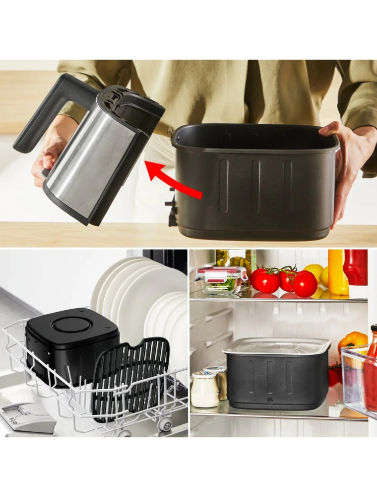 На корзине съемная накладка с ручкой. В комплекте крышка на корзину для хранения в холодильнике. Рецепты в приложении My Tefal.