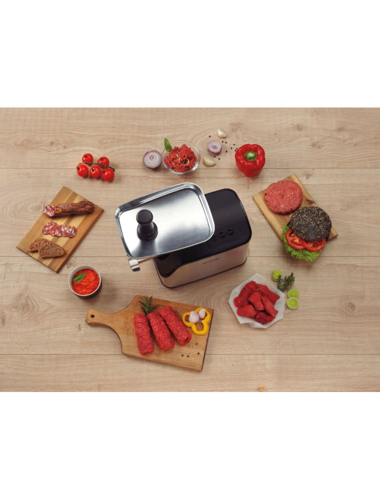 При пиковых нагрузках мощность двигателя достигает 2200 Вт. Но система безопасности позаботится о том, чтобы он проработал как можно дольше: она защищает двигатель от перегрева и мгновенно останавливает его при обнаружении любой неисправности. Gorenje MG2202XE способна справляться с большим количеством продуктов — ее производительность составляет 2.2 кг за минуту. Скорость работы всего одна, но зато доступна функция реверса. Она включает обратный ход, который поможет очистить шнек от застрявших кусочков, жил и костей. Комплектация свидетельствует о том, что прибор больше рассчитан на приготовление мясных изделий. В набор входят две решетки для фарша мелкого и грубого помола, а также насадки для домашних колбас и кеббе (полых мясных трубочек).