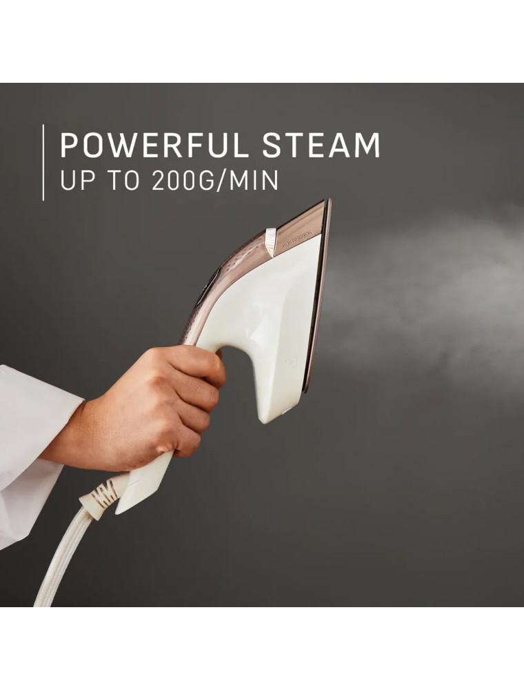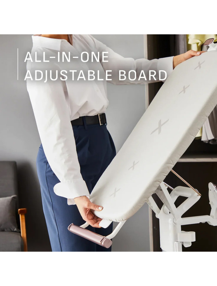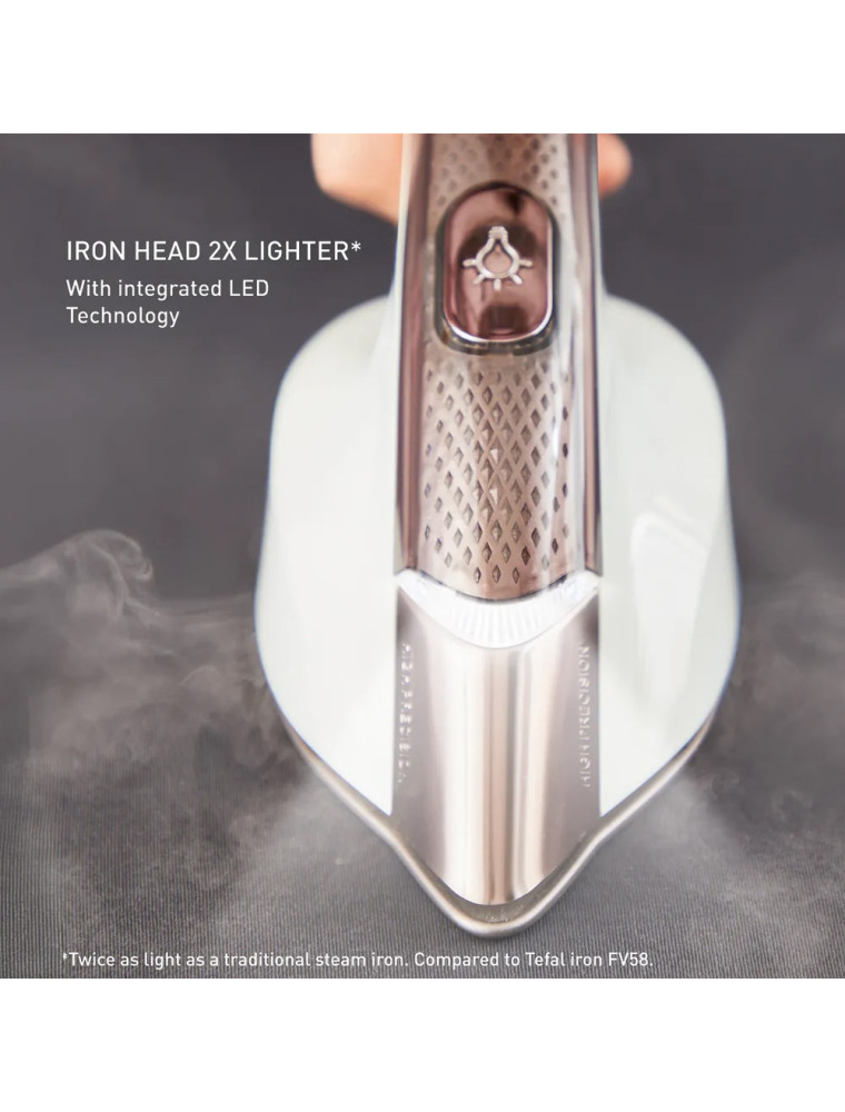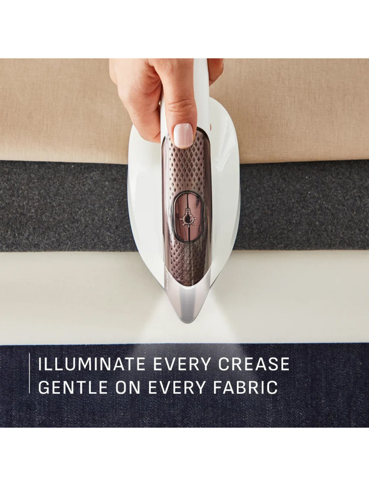 У отпаривателя присутствуют колеса для перемещения и подсветка ткани. Материал подошвы: керамика.
