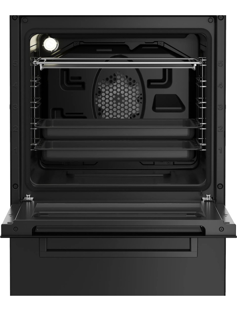 Сзади расположены две стандартные конфорки среднего размера на 2000 Вт, спереди слева — самая мощная, а справа — вспомогательная. Плита Beko FSM 52334 DAO предусматривает 60-литровую электродуховку, причем рабочая камера помимо классических нагревателей (верхнего и нижнего) имеет гриль и конвекцию (с отдельным кольцевым нагревателем). В общей сложности здесь предусмотрено 8 режимов, включая 3D-приготовление, размораживание и несколько вариантов грилирования.