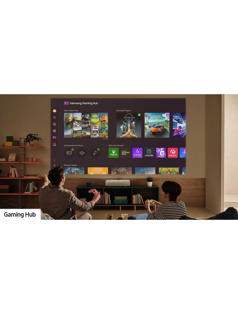 Позволяет получить изображение до 130". Работает со SmartThings. Встроенный игровой хаб. Q-Symphony — синхронизация звука с внешним саундбаром. Работа с Zigbee / Thread через внешний модуль (не входит в комплект).
