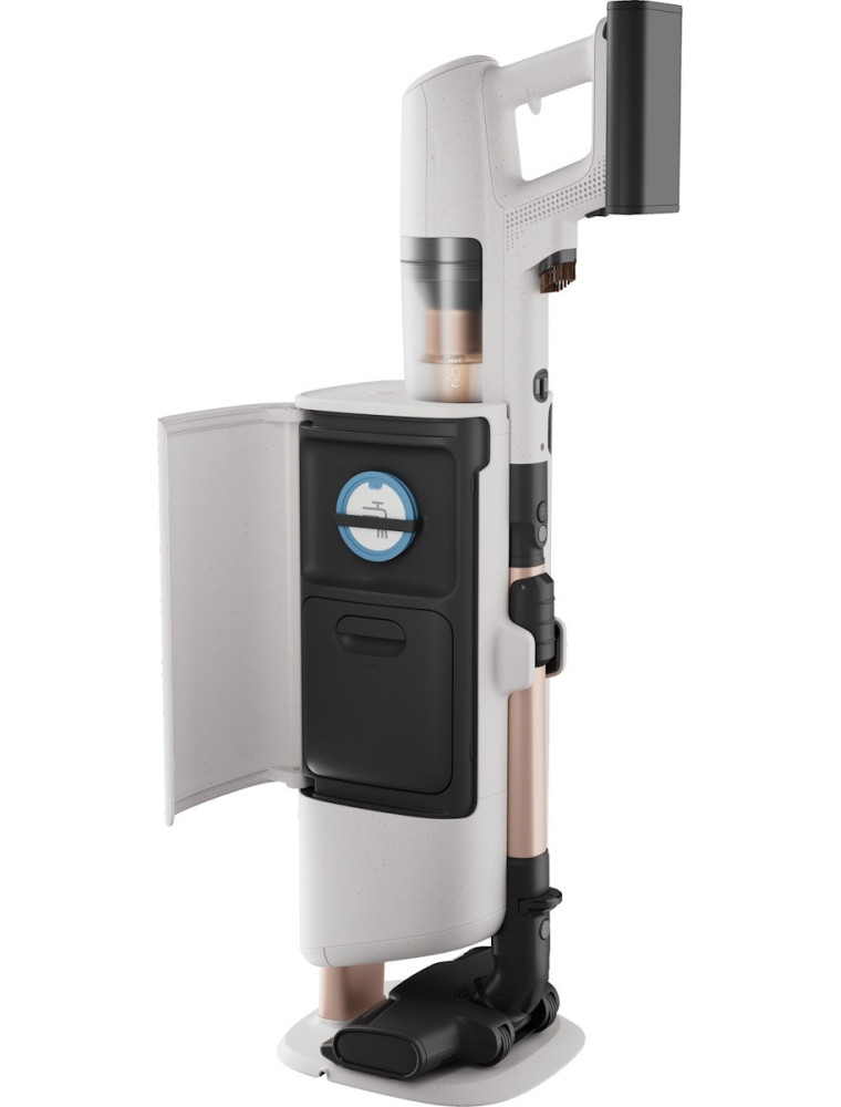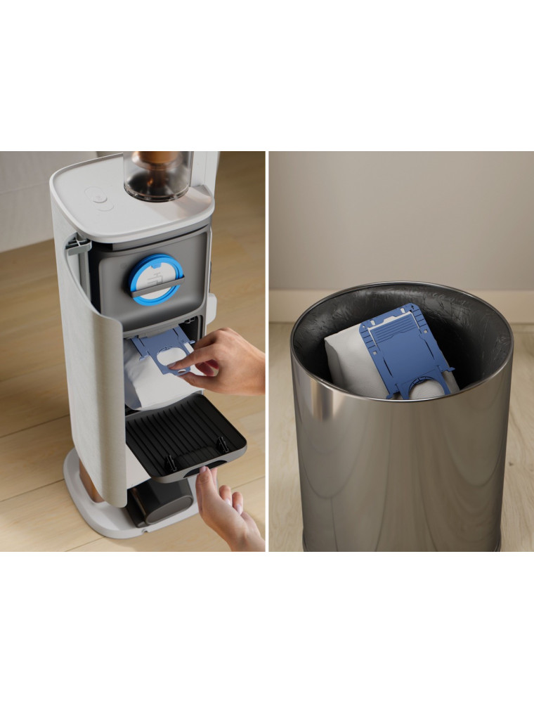 Это значительно расширяет радиус уборки, позволяя очищать мебель, постель, локальные загрязнения и даже салон автомобиля. Высота трубы регулируется в зависимости от роста пользователя. Во-вторых, в оснащение входит многозадачная док-станция. Она самостоятельно выгружает из пылесборника собранный мусор, отправляя его в более вместительный 2-литровый мешок. Это избавляет пользователя от необходимости контактировать с мусором приблизительно на 8 недель.