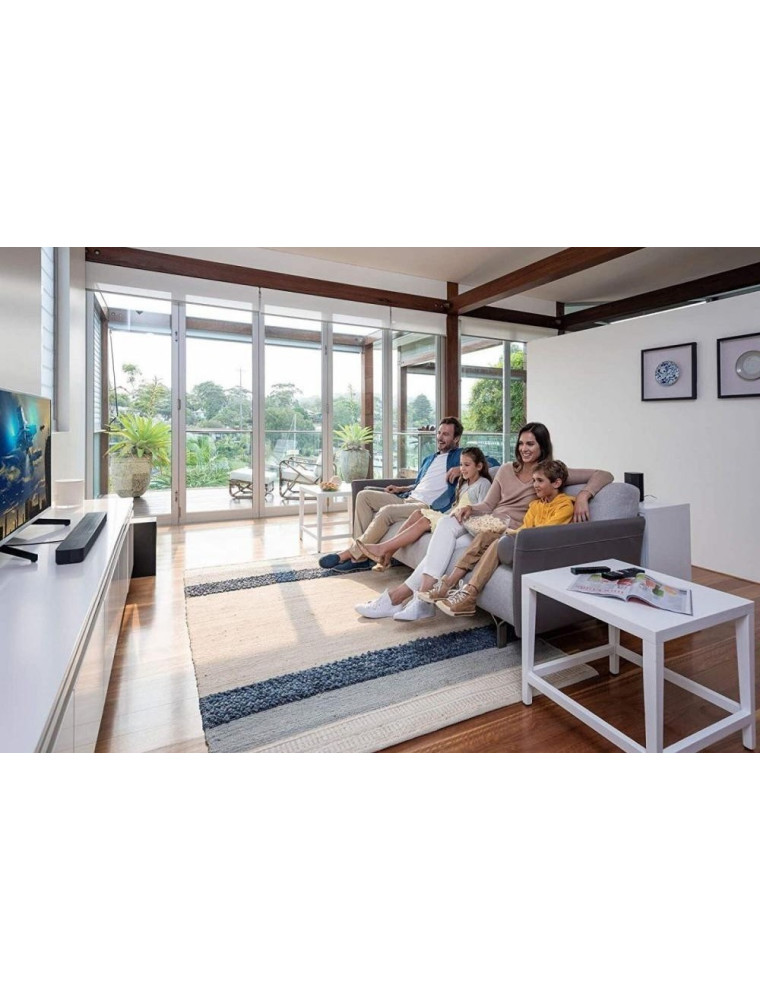 Качественно звучащий брендовый саундбар формата 5.1 с беспроводным (Bluetooth) и кабельным (HDMI, оптика) подключением, полноценным сабвуфером, тыловой акустикой, поддержкой стриминга аудиоконтента с гаджетов и полноценным объемным звуком Dolby Digital. Предназначен для повышения качества воспроизведения звука телевизорами, встроенные динамики которых, как правило, дают плоский звук с недостаточно выраженным басом, слабой разборчивостью речи и малой громкостью.
