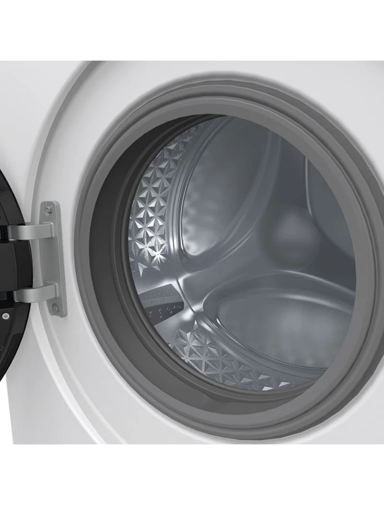 Панель управления состоит из привычного поворотного регулятора для выбора программ, кнопок и небольшого LED дисплея, который отображает информацию о выбранных настройках, продолжительности цикла и возможных неисправностях. Внутри установлен инверторный двигатель, главными преимуществами которого являются длительный срок службы, энергоэффективность и тихая работа — даже во время отжима уровень шума не превышает 72 дБ.