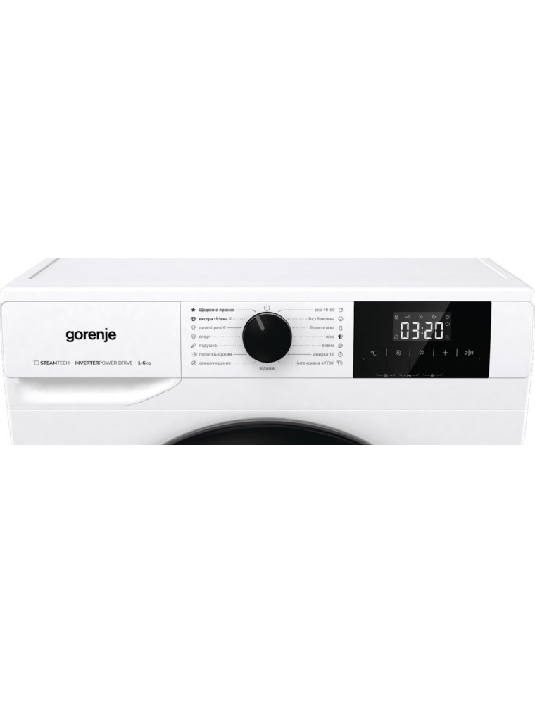 Помимо этого, у Gorenje W3NGPI 62 SBS/UA есть программа экспресс-стирки всего за 15 минут для быстрого освежения одежды и программа SterilTub для самоочистки барабана. В случае, если вы забыли какие-либо вещи, функция AddClothes позволяет поставить на паузу цикл стирки на начальных этапах и добавить или вытащить необходимую одежду. Также в число полезных функций входят таймер окончания стирки и защита от детей — блокировка управления, чтобы исключить случайные нажатия. Управление осуществляется с помощью классического поворотного регулятора для выбора программ, обычных кнопок и небольшого LED дисплея, на котором отображается информация о выбранных настройках, продолжительности цикла и возможных ошибках.