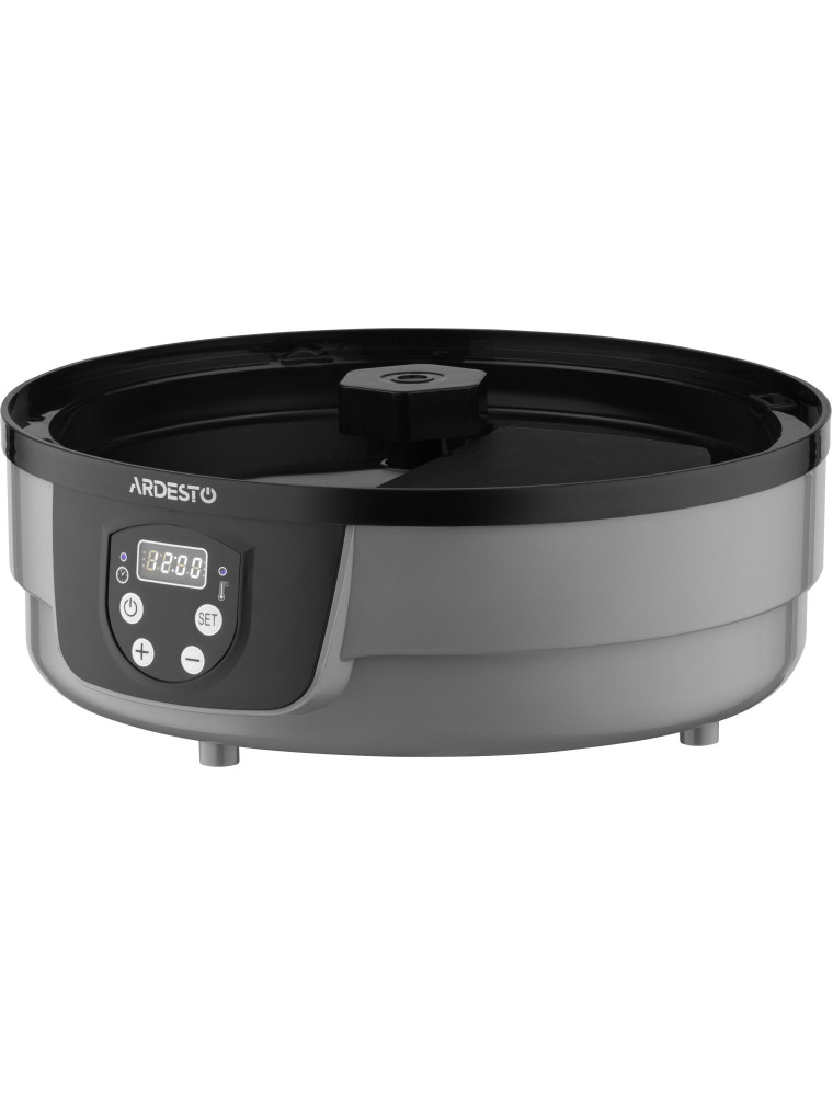 Дебютант 2025 года в линейке торговой марки Ardesto — это стильная вертикальная электросушилка средней ценовой категории. Ее рекомендуется использовать прежде всего с фруктами, овощами и различными ягодами. К важным особенностям прибора с нижним расположением 250-ваттного нагревательного элемента относится наличие механизма вращения поддонов. Это способствует более равномерному высушиванию и качественным итоговым результатам удаления избыточной влаги.