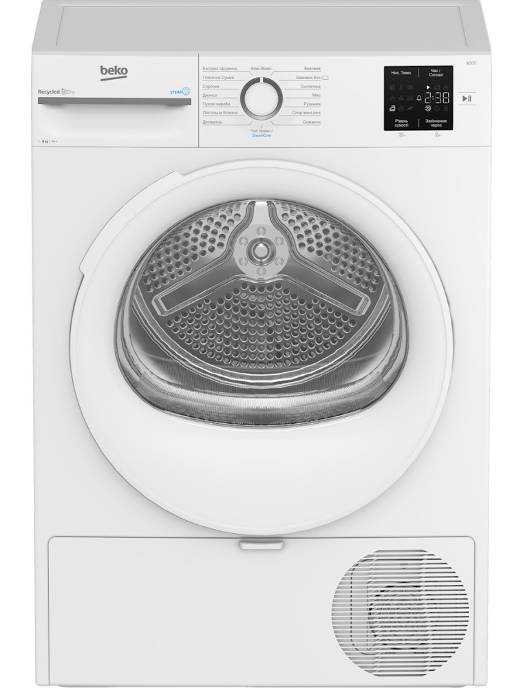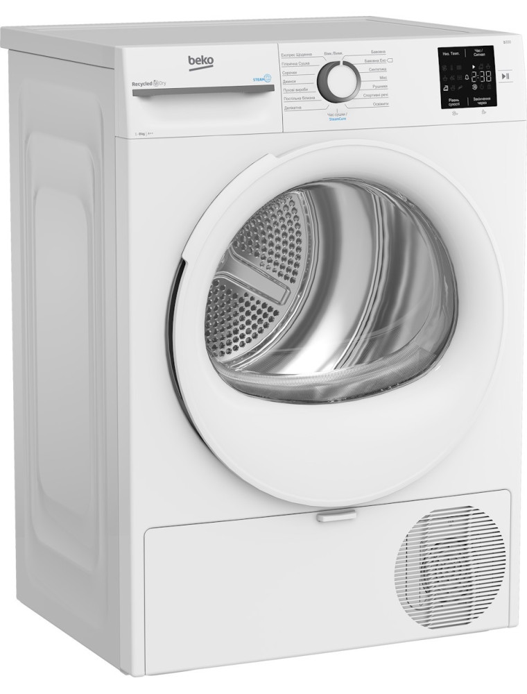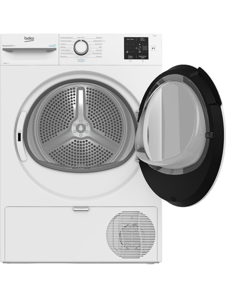 Наиболее совершенная и в то же время наиболее дорогая разновидность конденсационных сушильных машин. Подробнее о конденсационной сушке в целом см. выше. Здесь же отметим, что в моделях данного типа холодильник работает за счет теплового насоса — компрессора, который отбирает излишки тепла из конденсационной камеры и передает его на нагреватель. За счет этого обеспечивается ряд преимуществ перед традиционной рекуператорной сушкой. Одно из самых заметных — высокий КПД и экономичность: тепловой насос фактически позволяет многократно использовать накопленную тепловую энергию, а на его работу затрачивается меньше электричества, чем на постоянный нагрев воздуха в рекуператорных моделях. Кроме того, сушка происходит проще и быстрее, причем скорость работы практически не зависит от наружных условий. Да и лишнего тепла подобная машина почти не вырабатывает. Недостатки моделей с тепловым насосом традиционны — сложность и высокая стоимость.