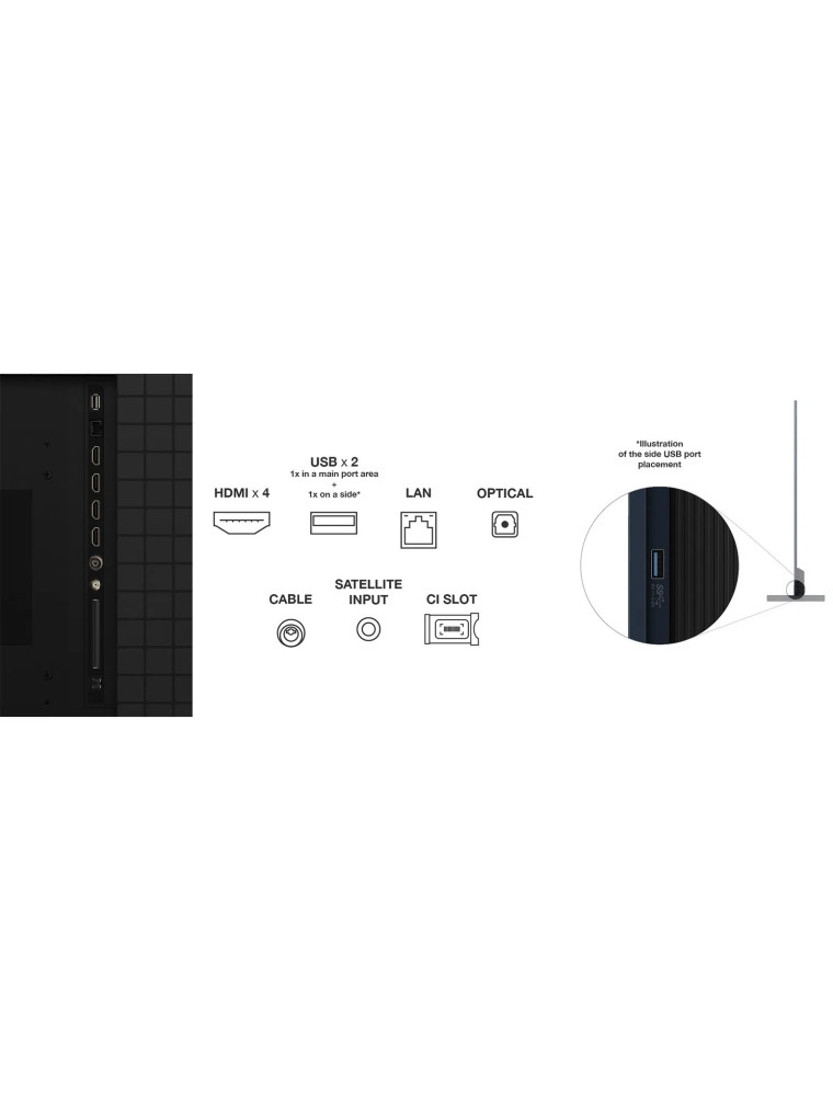 Пиковая яркость HDR до 6500 кд/м². Возможность преобразования SDR контента в HDR. Регулируемая по высоте подставка.