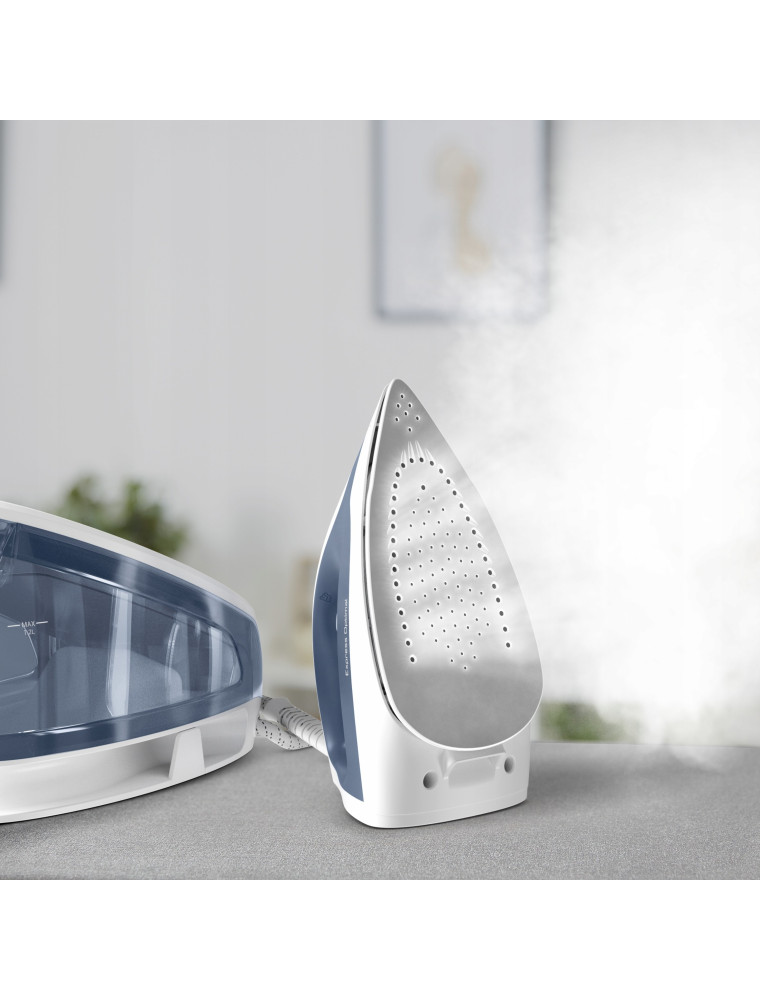 По всей поверхности подошвы, в том числе на носике, расположены отверстия для равномерного распределения пара. Благодаря этому утюг устраняет складки даже в труднодоступных местах: возле швов, карманов и замков. Также в оснащение парогенератора входит бак для воды объемом 1.2 л, который обеспечивает длительную глажку без необходимости долива. Полезными будут функции автоотключения и самоочистки. Оставленный без присмотра прибор через некоторое время самостоятельно выключается, обеспечивая безопасность. А функция самоочистки позволяет быстро и легко очистить паровые проходы от скопившейся накипи и прочих отложений, что способствует сохранению высокой производительности и продлению срока службы техники.