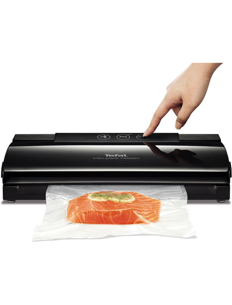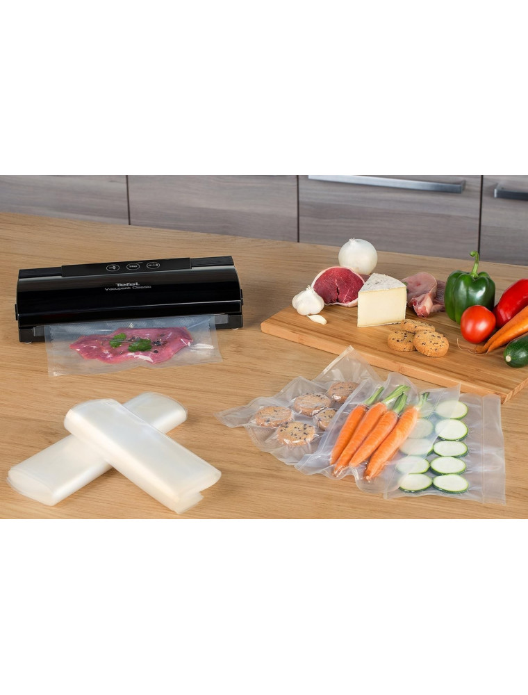 Модель также примечательна своим универсальным дизайном с глянцевой отделкой и понятными органами управления с кнопками. Вакууматор Tefal VT254070 можно использовать с различной пищей, в том числе содержащей достаточно большое количество влаги. В комплектацию включены 18 пакетов для упаковки: 10 штук поменьше — размером 22 на 30 см и 8 — чуть покрупнее — 28 на 25 см. Пользователям предложены два основных режима работы — только «запечатывание» и полный цикл — вакуумирование и герметизация. Из других особенностей прибора стоит выделить длину сварочной рейки в 310 см, так что тут без проблем можно применять пакеты шириной 30 см. Еще модель отличается небольшим энергопотреблением (мощность 110 Вт) и хорошим рабочим ресурсом, так как производитель обещает 10-летнюю ремонтопригодность.
