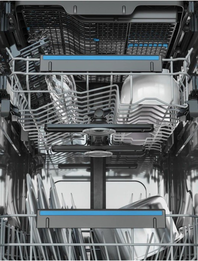 Дополнительные функцию включают отсрочку старта до 24 часов, самоочистку Machine Care, гигиеническую обработку ExtraHygiene. За общее повышение результатов мытья отвечает присутствие дополнительных форсунок — системы распылителей SatelliteClean внизу и двойного разбрызгивателя вверху рабочей камеры. К приятным фишкам оснащения относится луч-индикатор TimeBeam, проецирующий на пол отсчет обратного времени до завершения мытья, функцию автоматического открывания дверцы AirDry для повышения качества сушки, а также общую экономичность (класс энергопотребления D и средний расход до 10 литров воды за цикл).