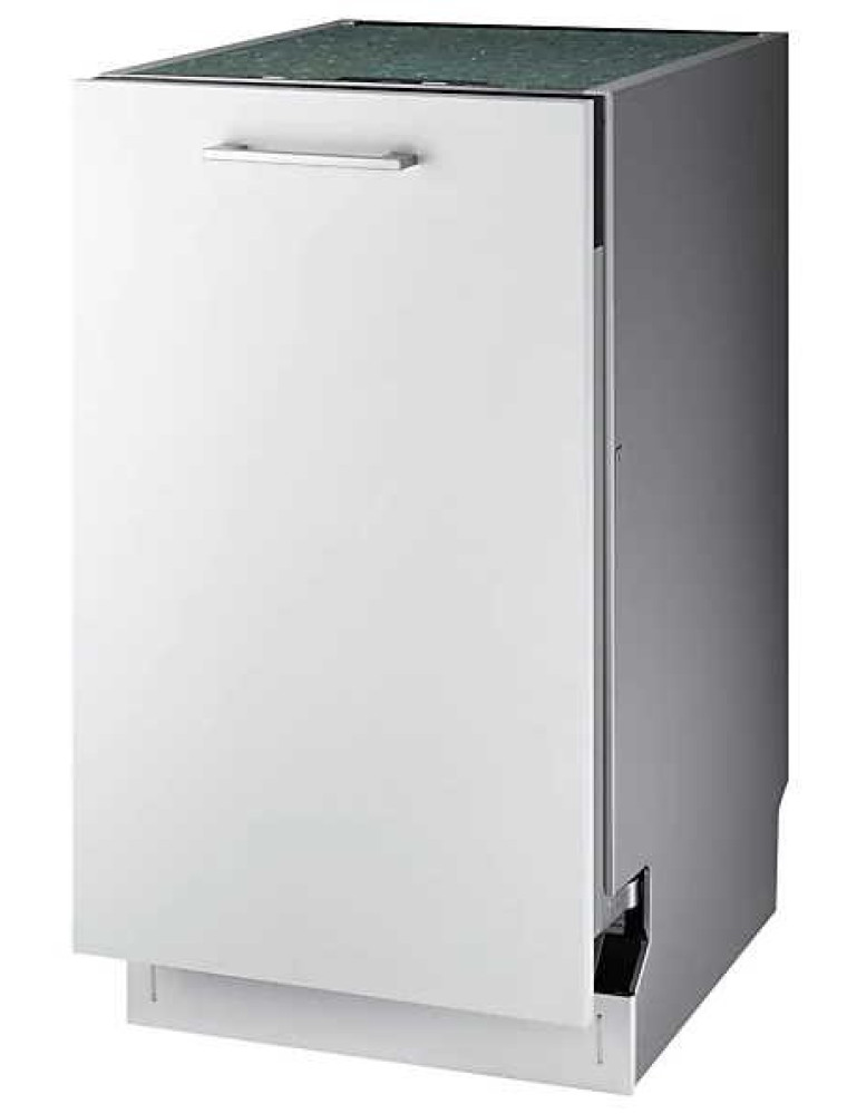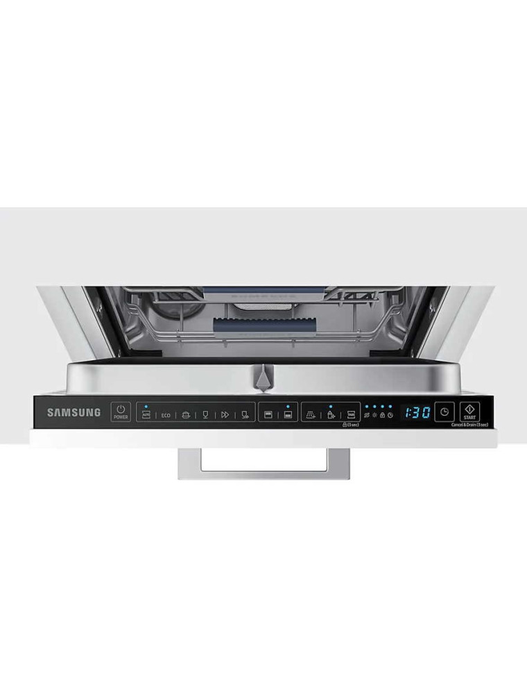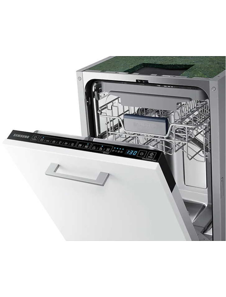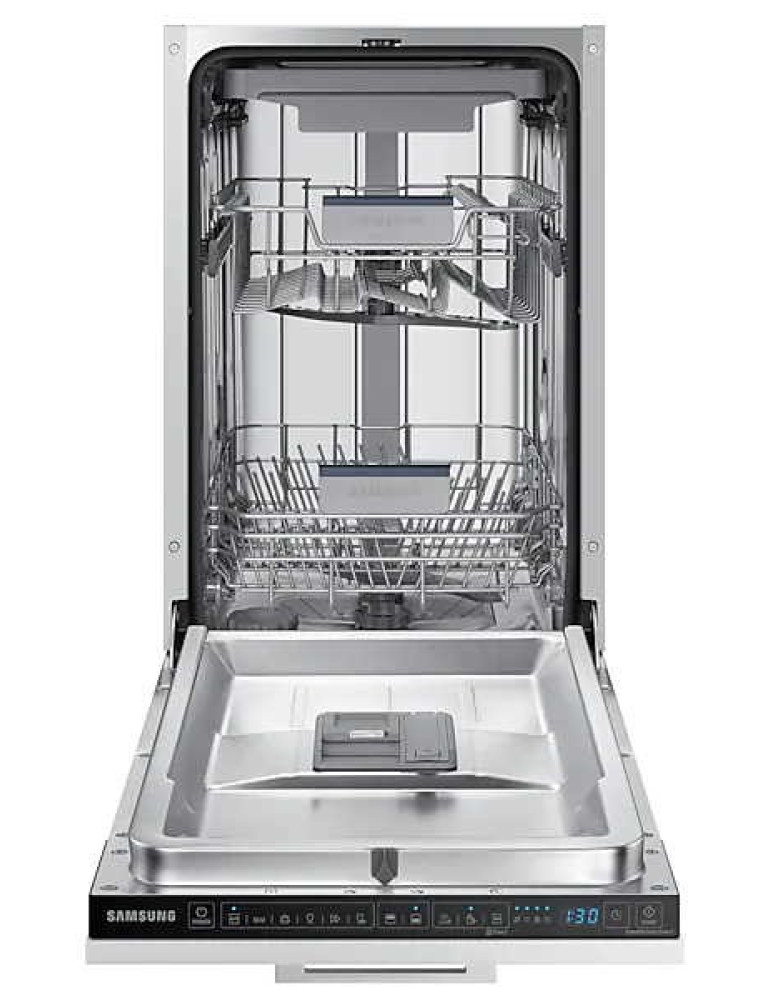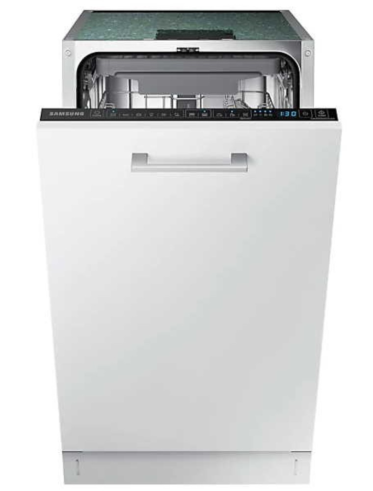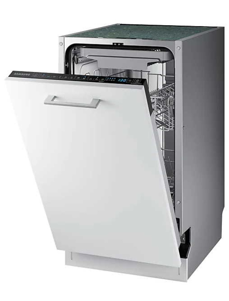 Представленная в 2020 году узкая (ширина для встраивания 45 см) посудомоечная машина компании Samsung — это решение среднего сегмента, предусматривающее удобное сенсорное управление. Производитель декларирует невысокий уровень шума в работе, который не должен превышать 44 дБ. В рабочей камере помещается до 10 комплектов посуды, а для того, чтобы была возможность разместить внутри крупную утварь имеется регулировка верхней корзины по высоте (до 5 см).
