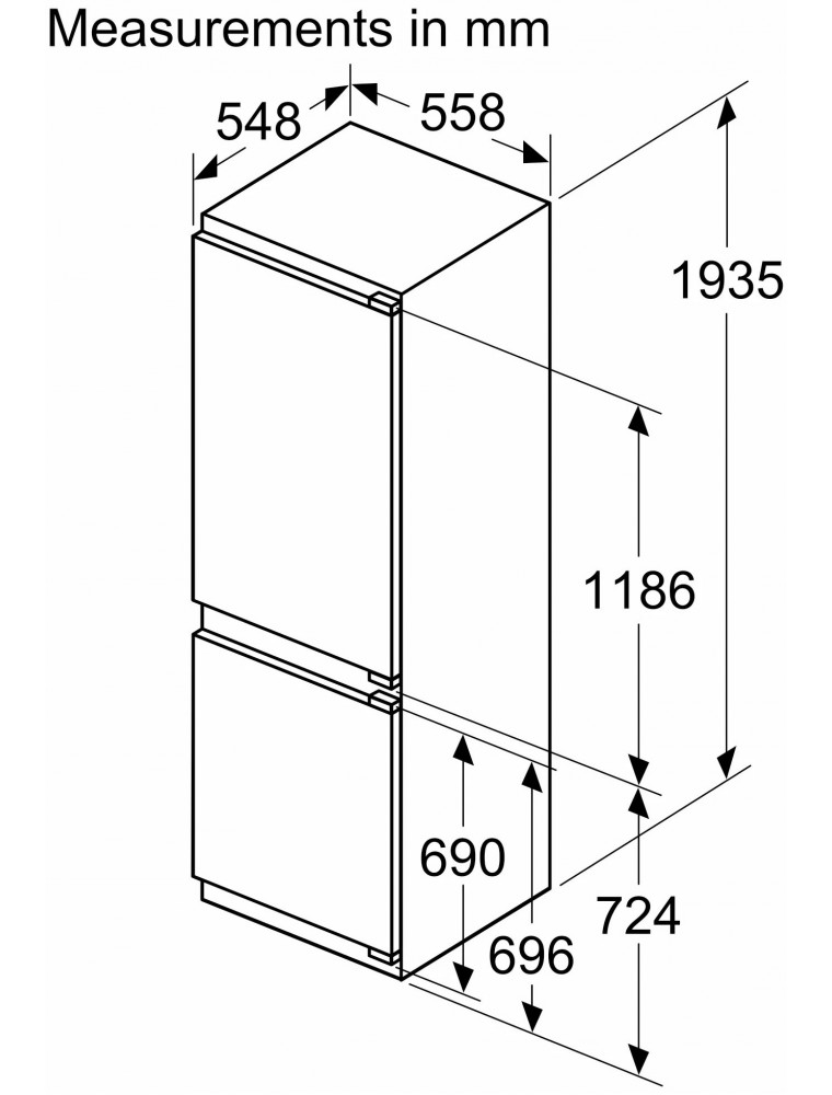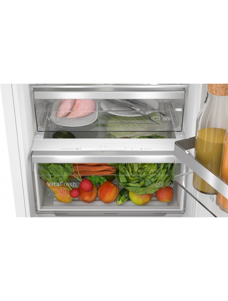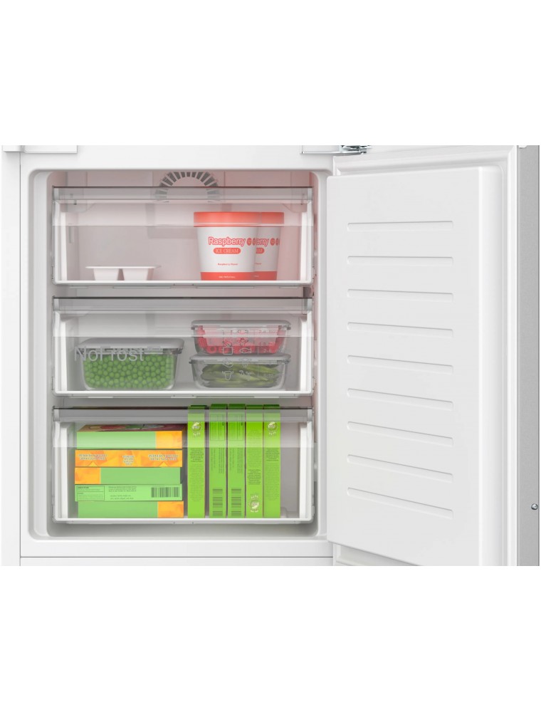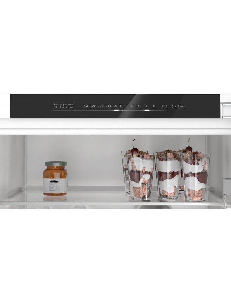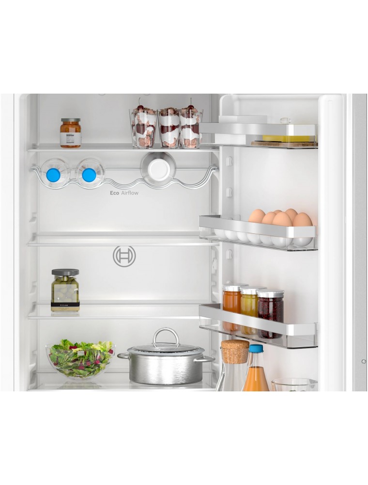 Встраиваемый холодильник известного немецкого производителя Bosch представляет собой классическую и не слишком габаритную модель с двумя независимыми камерами — для охлаждения и заморозки. Объем холодильной камеры составляет 215 литров и в ней есть все необходимое для правильной организации пространства: 4 полки из прочного, безопасного, небьющегося стекла, ящик с температурой около 0 °C для хранения мяса и рыбы, вместительный ящик с оптимальными условиями для овощей, фруктов и зелени, металлический держатель для бутылок и несколько боковых полок для размещения негабаритных продуктов.