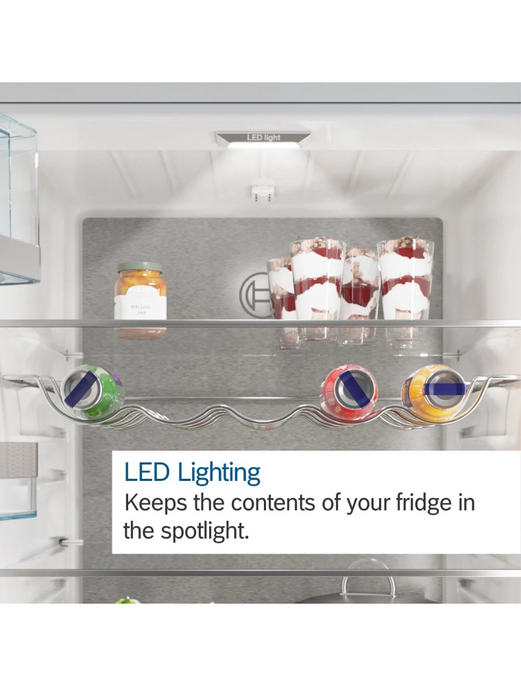 Функция Super Cooling позволяет понизить температуру на 2 °C для быстрого охлаждения покупок, а примерно через 6 – 15 часов система автоматически возвращает предыдущие настройки. Помимо этого, холодильная камера автоматически размораживается и дополнена светодиодной подсветкой для лучшей видимости содержимого. Морозильная камера Bosch KIN 96VFD0 объемом 75 литров расположена в нижней части корпуса и содержит три выдвижных ящика для хранения продуктов.