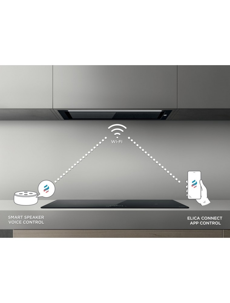 Высокопроизводительная и высокотехнологичная полновстраиваемая итальянская вытяжка c периметральным всасыванием и цифровой системой управления с возможностью удаленного управления через Wi-Fi-соединение. Позиционируется как продукт верхней ценовой категории 2021 года, ориентированный на требовательных пользователей, выбирающих надежную бытовую технику со smart-функциями. Регулировать производительность всасывания и управлять подсветкой кухонной вытяжки Elica Hidden 2.0 BLGL/A/60 можно кнопками на рабочей поверхности, с помощью голосового помощника или со смартфона с приложением Elica Connect.