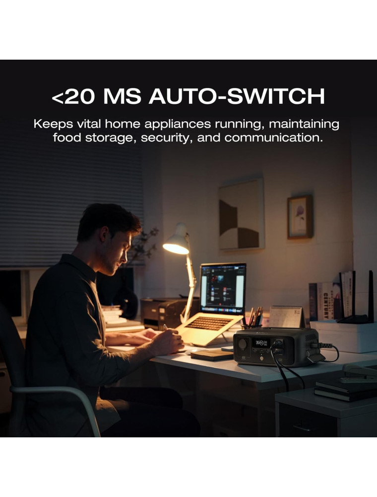 Маленькая зарядная станция с функцией «бесперебойника», оборудованная литий-железо-фосфатной батареей на 245 Вт*ч. При отключениях электроэнергии модель автоматически переключает подключённую технику на питание от встроенного аккумулятора в течение 10 мс. EcoFlow River 3 UPS поддерживает работу с нагрузкой общей мощностью до 300 Вт и вытягивает пиковые скачки мощности на уровне до 600 Вт.